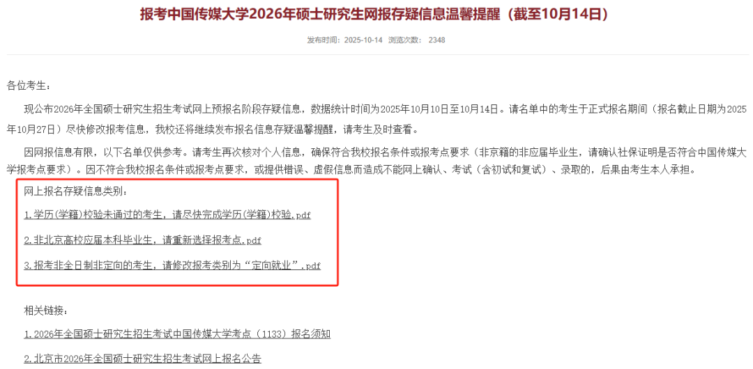 中国传媒大学:发布 2026 年硕士研究生网报存疑信息提示,涉及百余名考生,可通过院校研招网查看详情
