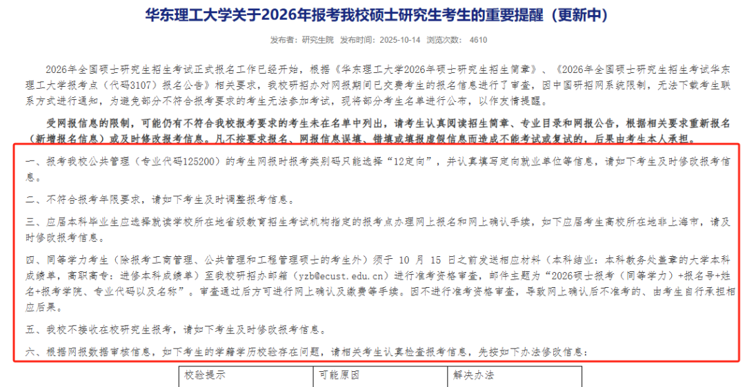 华东理工大学:推出报考重要提醒,同步附上 6 份 “报名出错 / 不符合条件 / 信息存疑” 人员名单,且名单会持续更新