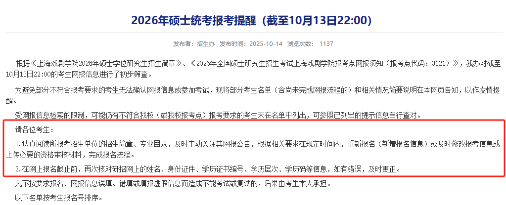 上海戏剧学院:发布截至 10 月 13 日 22:00 的统考报考提醒,明确 “报考点选错” 的考生需在报名结束前完成报考点更换
