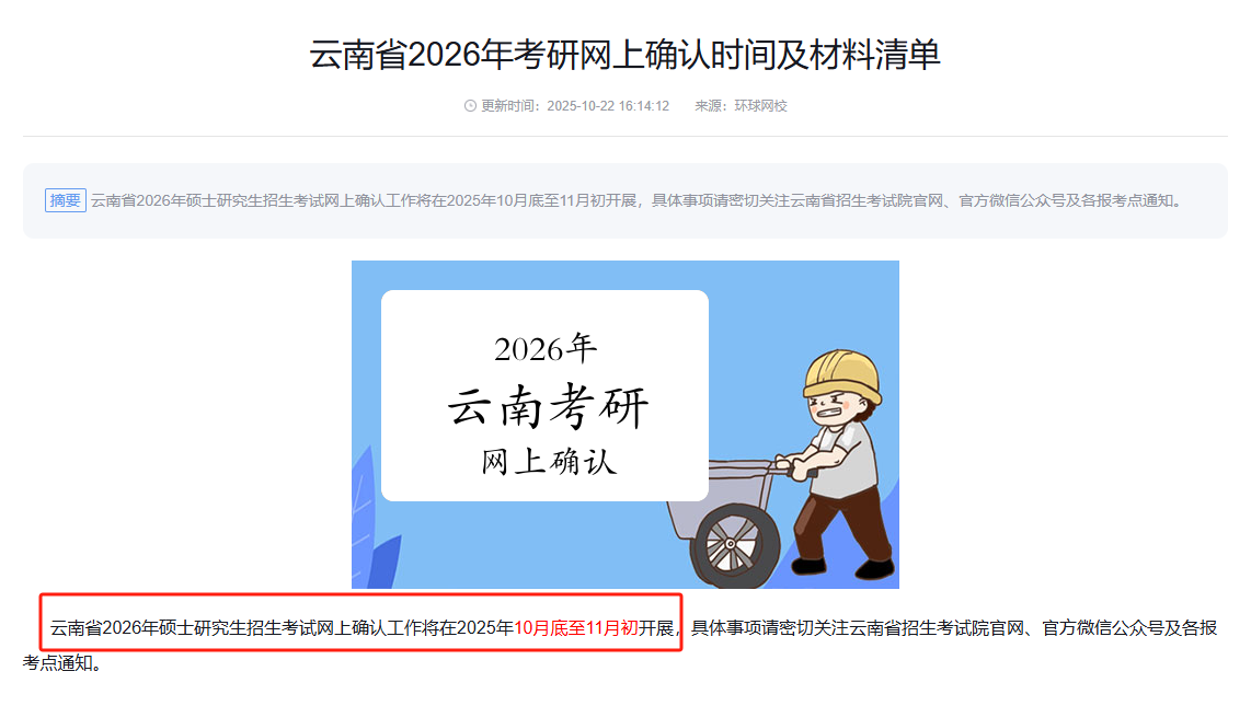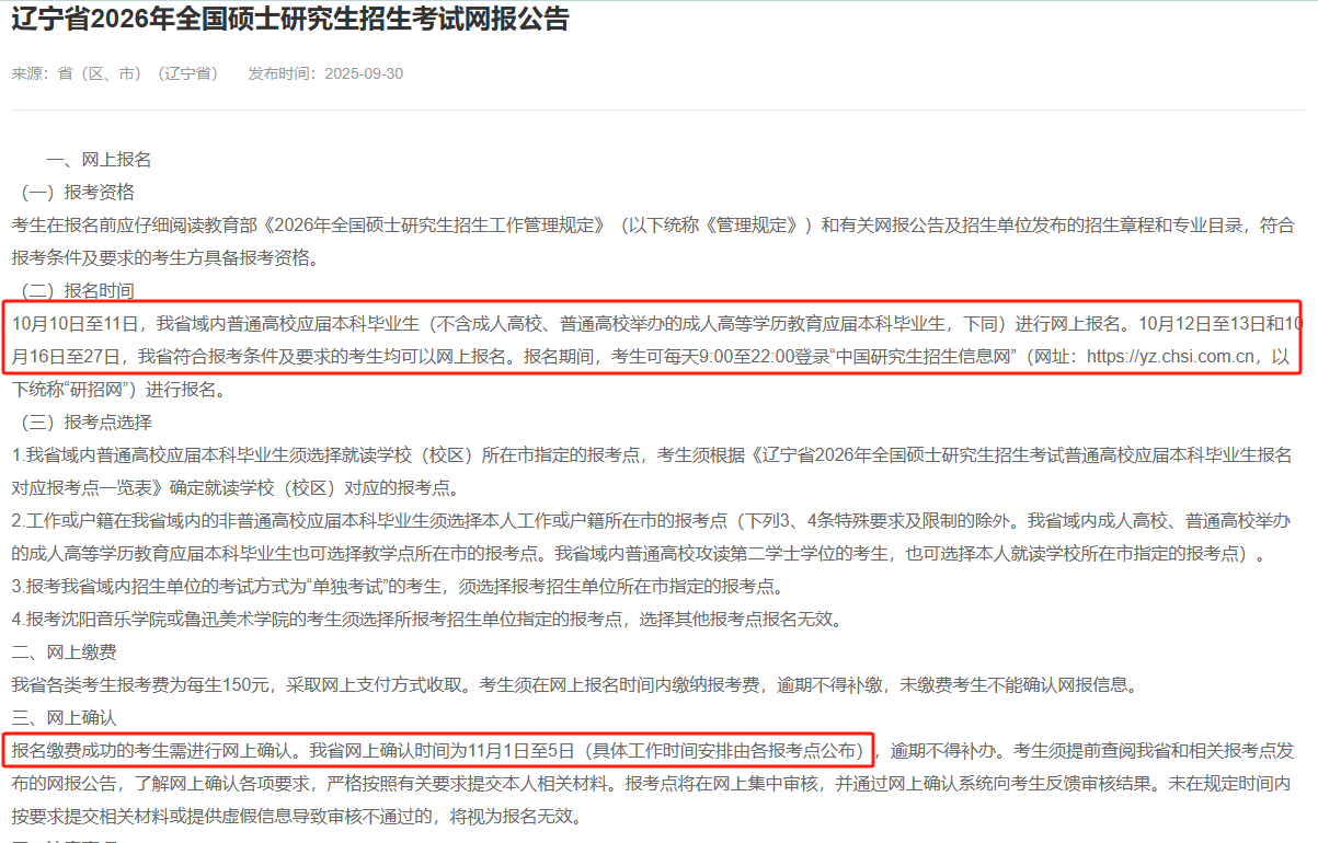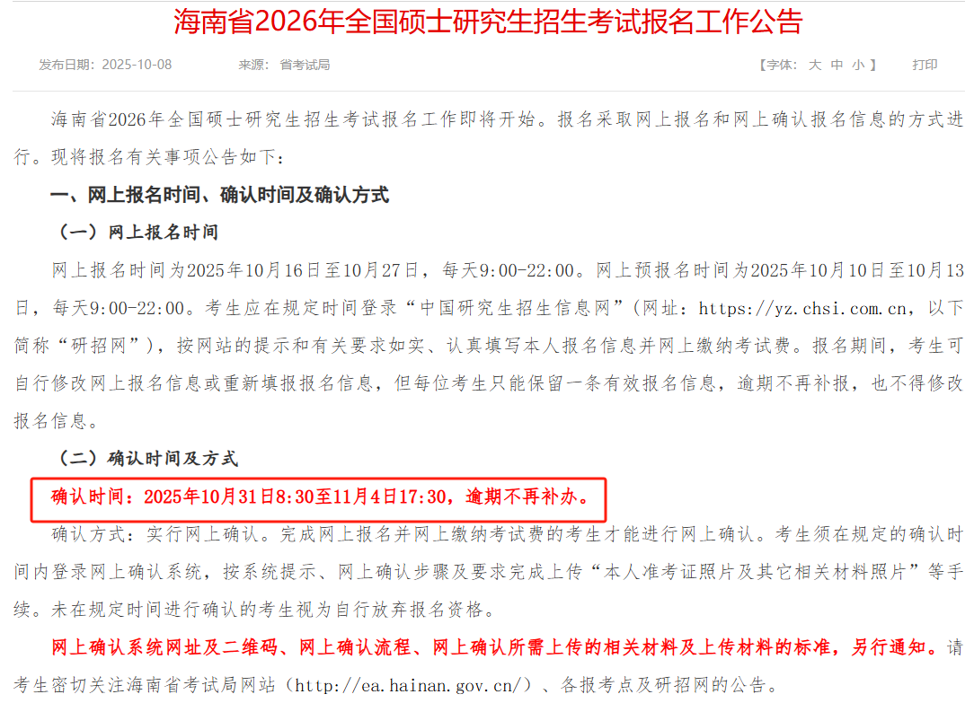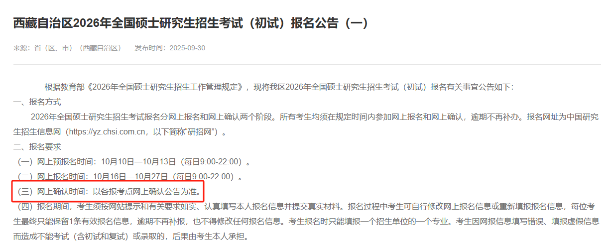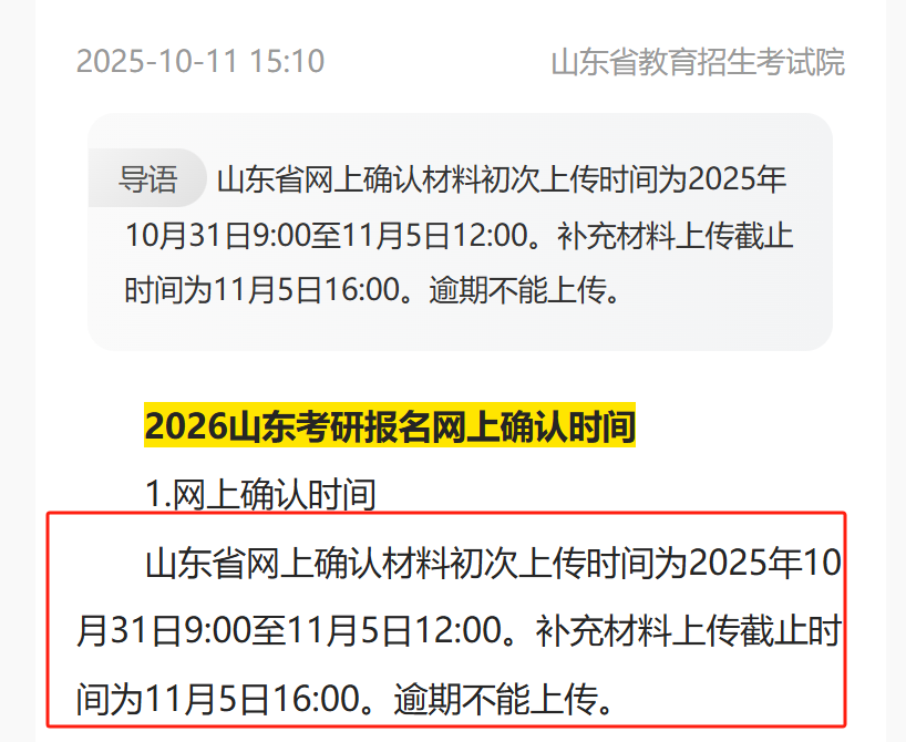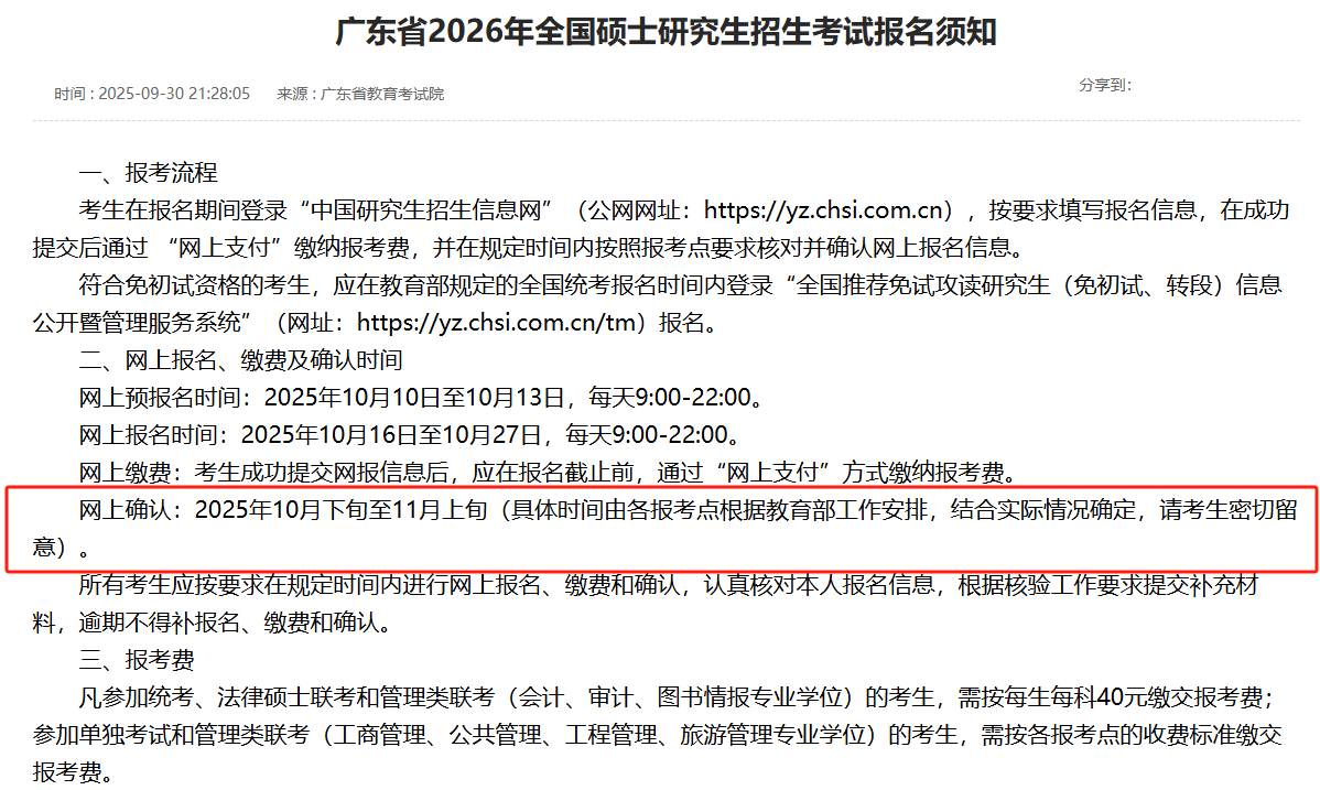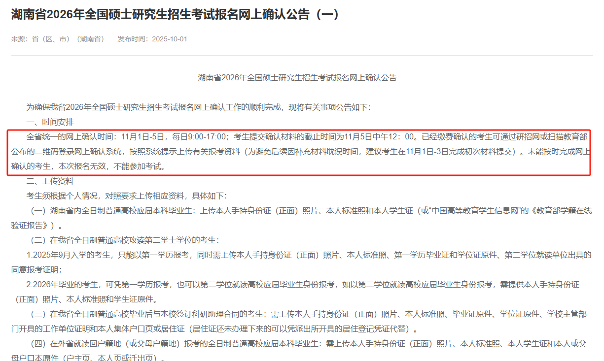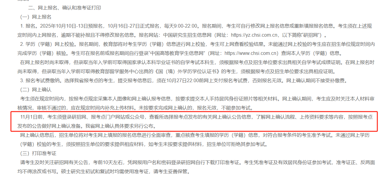 网上确认安排:2025 年 11 月 1 日前,考生需登录研招网、报考点官网或公众号,查看所选报考点的网上确认公告(含时间、流程、材料要求),全省具体确认时间将随公告另行公布