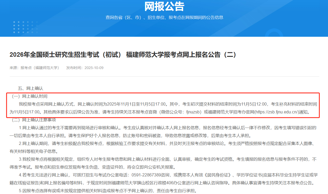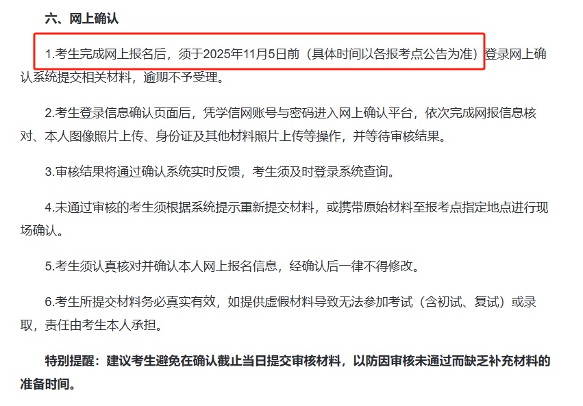 关键截止点:考生提交确认材料的最终截止时间为 11 月 5 日中午 12:00(建议 11 月 1 日 - 3 日完成初次提交,预留补充时间)