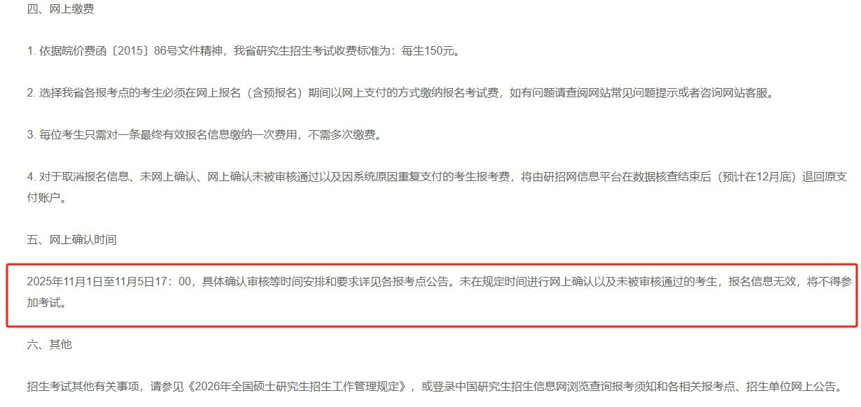 网上确认时间:2025 年 11 月 5 日前(具体开始时间及操作时段以所选报考点公告为准)