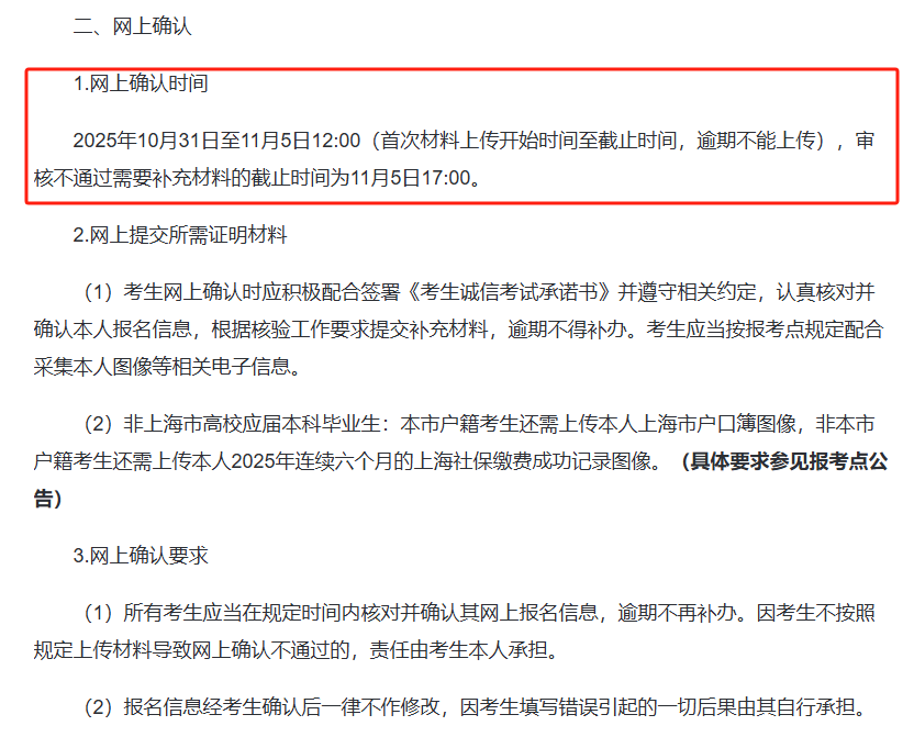 网上确认时间:2025 年 11 月 1 日至 11 月 5 日 17:00(各报考点会细化审核时段,需关注报考点公告)