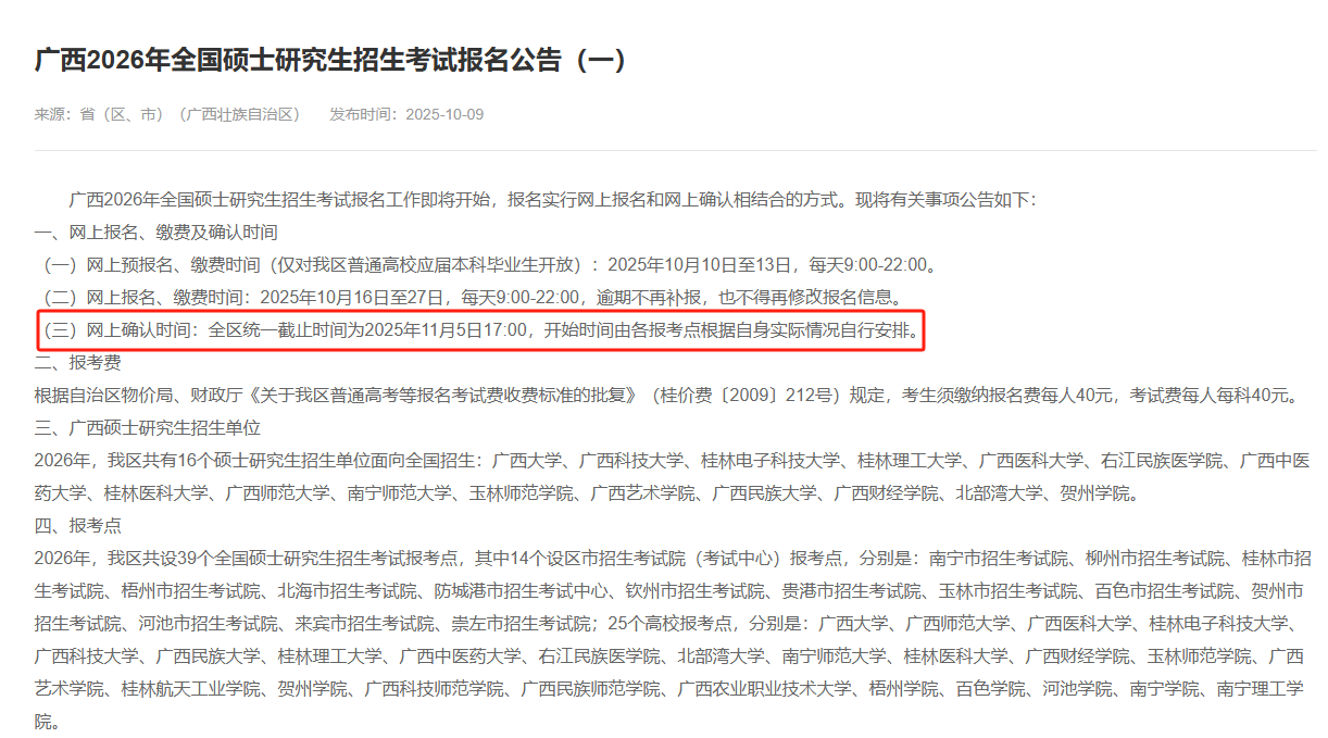 网上确认时间:全区统一截止时间为 2025 年 11 月 5 日 17:00,开始时间由各报考点根据实际情况自行确定