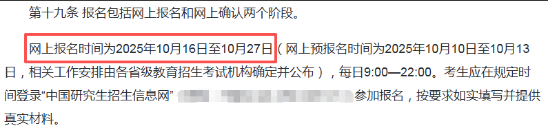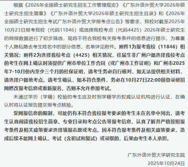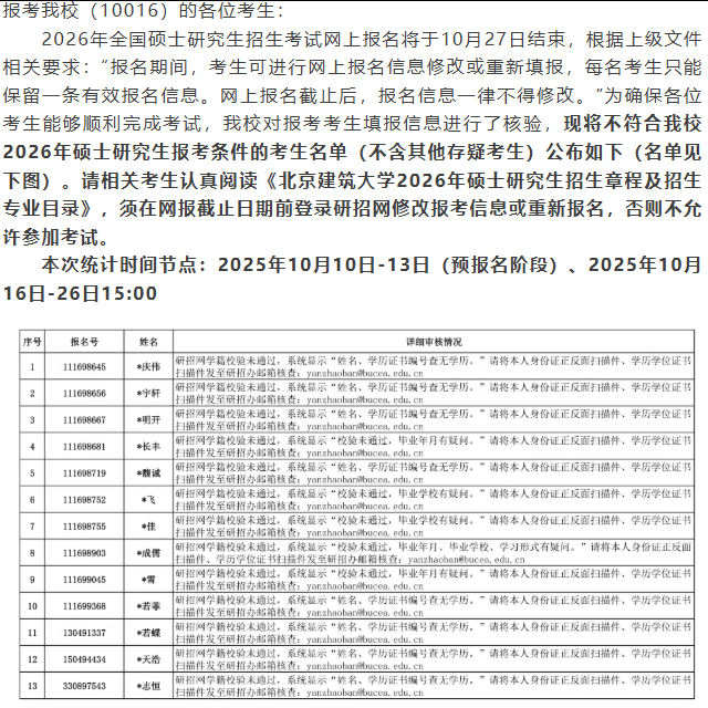 随着2026年研招统考报名截止时间(2025年10月27日22:00)临近,尚未完成报名、缴费,或需修改报名信息的考生,需抓紧最后时间完成相关操作。 网报结束前,以下三项核心事宜需重点关注,避免影响后续考试流程: 一、关键信息反复核查,审核问题及时处理 报名阶段,招生单位、报考专业、报考点是决定报名有效性的核心信息,考生需逐一项反复确认,确保无错漏。 若收到 “报考单位审核不通过” 的短信提醒,切勿忽视 ——需立即登录研招网报系统查看实时报考状态,根据系统提示精准修改报名信息; 若对修改要求存疑,需第一时间联系报考单位咨询,避免错过调整时机。 二、紧盯招生单位官网,警惕报名异常通知 近期各招生单位会通过官网发布针对性通知,比如“报名失败考生名单”“线下材料集中提交与审核要求” 等,考生需定期查看目标院校研究生招生网,确认自身信息是否在通知范围内。按照研招规定,报名信息与报考条件不符的考生,将被招生单位驳回报名资格,无法参与考试。 例如,广东外语外贸大学于10月24日发布《关于2026年硕士统考报名不符合我校规定的重要提示》,明确指出不符合该校报考条件的考生,需在10月27日22:00前登录研招网修改信息或重新报名,逾期将取消考试资格; 北京建筑大学也在10月26日公布《不符合我校2026年硕士报考条件的考生信息(三)》,列出不符合条件的考生名单(不含存疑考生),并要求相关考生对照招生简章调整报名信息,确保在截止前完成修正。 三、学历(学籍)核验不通过?按要求补材料 若考生在网报系统中查询到 “学历(学籍)核验未通过”,需重点关注招生单位发布的核验通知——按要求准备学历证书、学籍证明等相关材料,在单位规定的时间内提交核验,确保核验流程顺利完成。若未按时解决核验问题,可能影响后续网上确认,进而无法正常参加考试。 温馨提示 研招网“网报公告”栏目汇总了各省市招办、招生单位、报考点的具体要求,比如报考点选择规范、材料提交细则、特殊情况处理方式等,考生需逐一审阅,避免因遗漏关键要求导致报名无效。