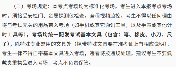 考场均统一配发考试基本文具(包含:笔、橡皮、小刀、尺子),除特殊专业需用的文具外(携带特殊文具要在准考证上有相应说明),考生一律不得自带基本文具进入考场,违者将按违规处理。
